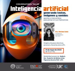 La Facultad de Arte y Diseño de UPC comparte en su Canal de YouTube el Conversatorio: «Inteligencia artificial generando textos, imágenes y sonidos: aportes e intercambios para pensar en sus implicancias”, que dictó la Dra. Mariana Costa el 31 de mayo de 2023.