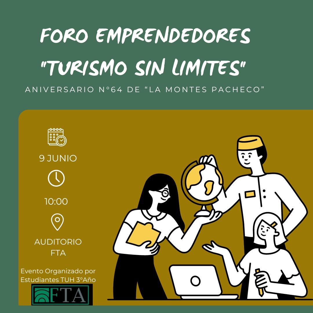 En el marco de la conmemoración de los 64 años de La Montes Pacheco, estudiantes de 3er año de Hotelería, como actividad final del espacio curricular Organización de Eventos, organizaron e invitan a estudiantes, docentes, autoridades de la facultad y público en general a participar del Foro de Emprendedores “Turismo sin límites”.