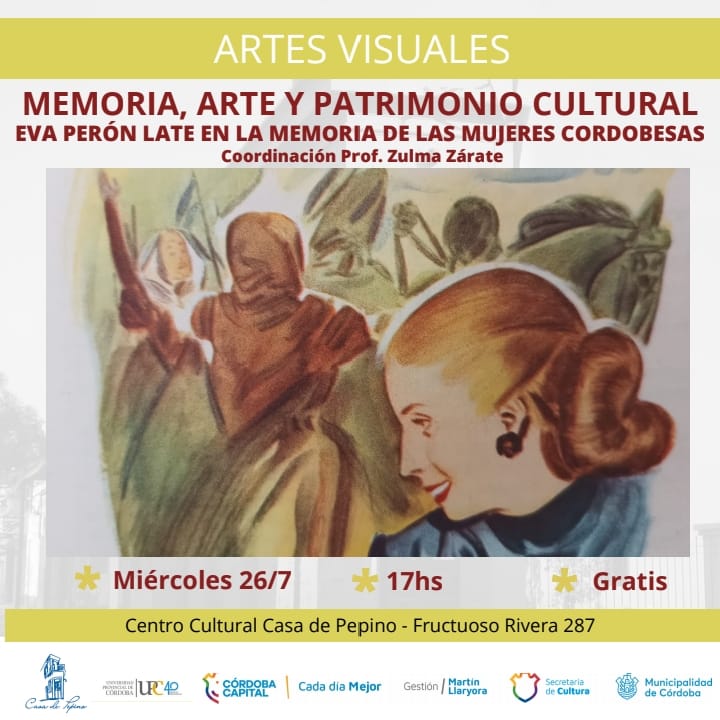 La Universidad Provincial de Córdoba te invita a participar de la Muestra Memoria, Arte y Patrimonio Cultural: Eva Perón Late en la Memoria de las Mujeres Cordobesas, que se inaugurará este miércoles 26 de julio a las 17 en el Centro Cultural Casa de Pepino (Fructuoso Rivera 287).