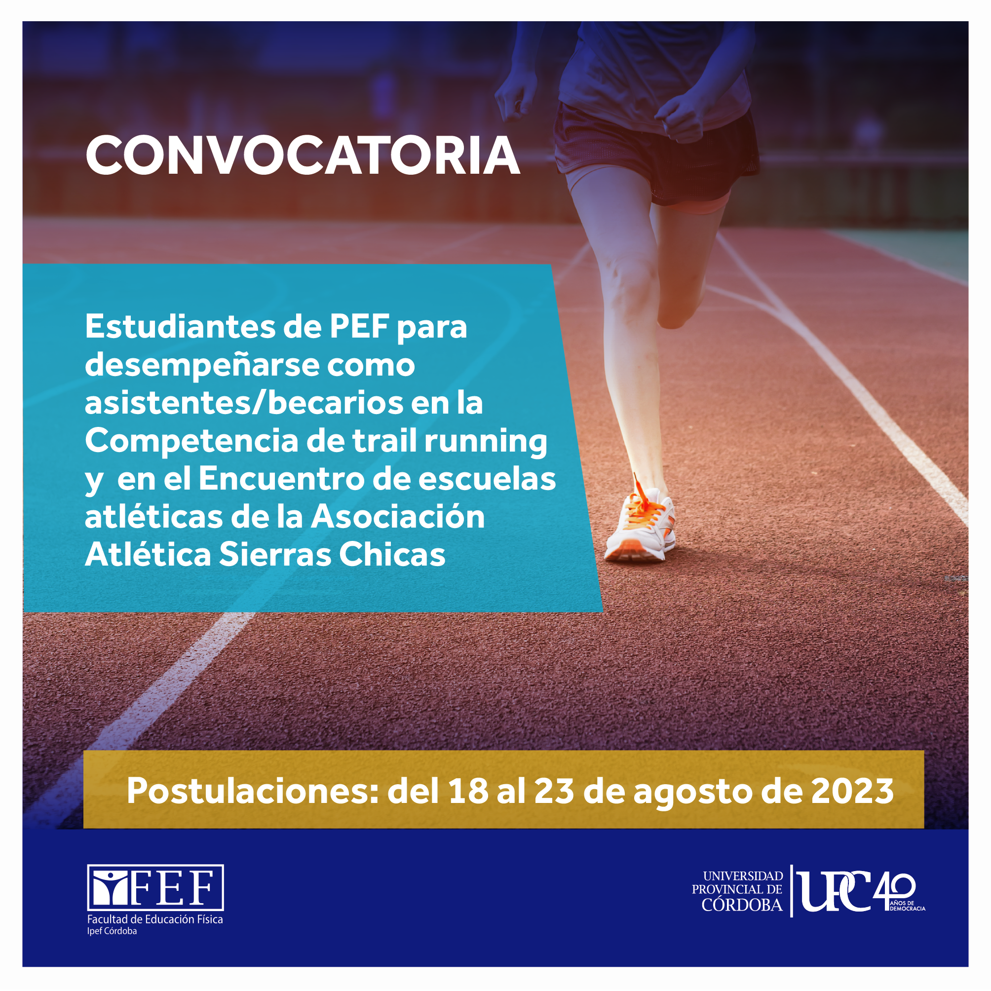 La Secretaría de Asuntos Estudiantiles y Graduados de la Facultad de Educación Física Ipef invita a estudiantes del Profesorado de Educación Física a postularse como asistentes/becarios en la Competencia Trail running Isquitipe Sol Luna y en el Encuentro de escuelas atléticas de la Asociación Atlética Sierras Chicas.