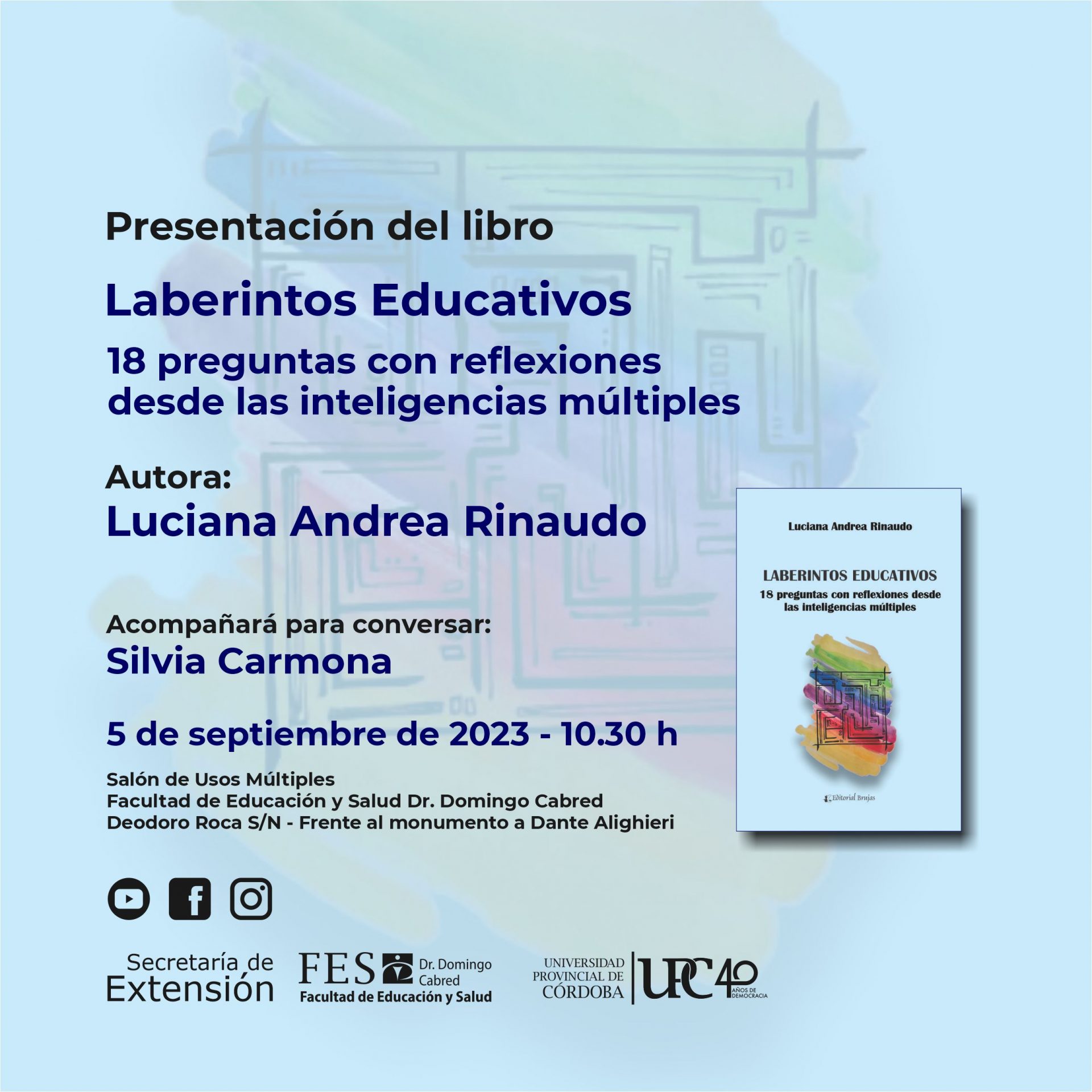 La Secretaría de Extensión de la Facultad de Educación y Salud Dr. Domingo Cabred (FES) en conjunto con el equipo de gestión directiva de la Licenciatura en Psicopedagogía de la facultad, invitan a la presentación del libro “Laberintos Educativos. 18 preguntas con reflexiones desde las inteligencias múltiples.” de Editorial Brujas, contaremos con la presencia de Luciana Andrea Rinaudo autora de la obra con quien recorreremos las páginas.