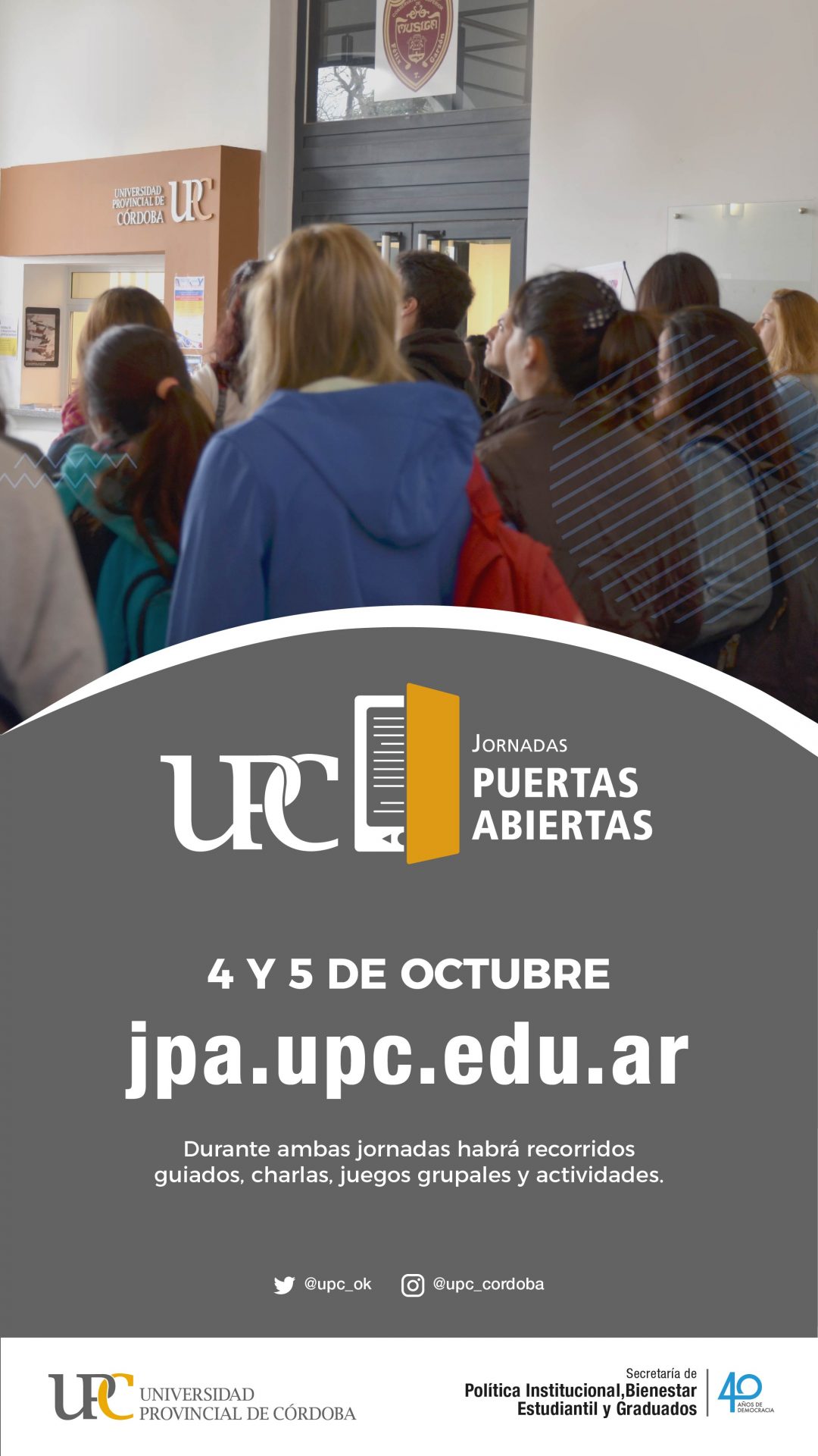 La Universidad Provincial de Córdoba, a través de su Secretaría de Política Institucional, Bienestar Estudiantil y Graduados, te invita a participar de las Jornadas de Puertas Abiertas 2023 (JPA), que se realizarán en modalidad presencial los días miércoles 4 y jueves 5 de octubre.