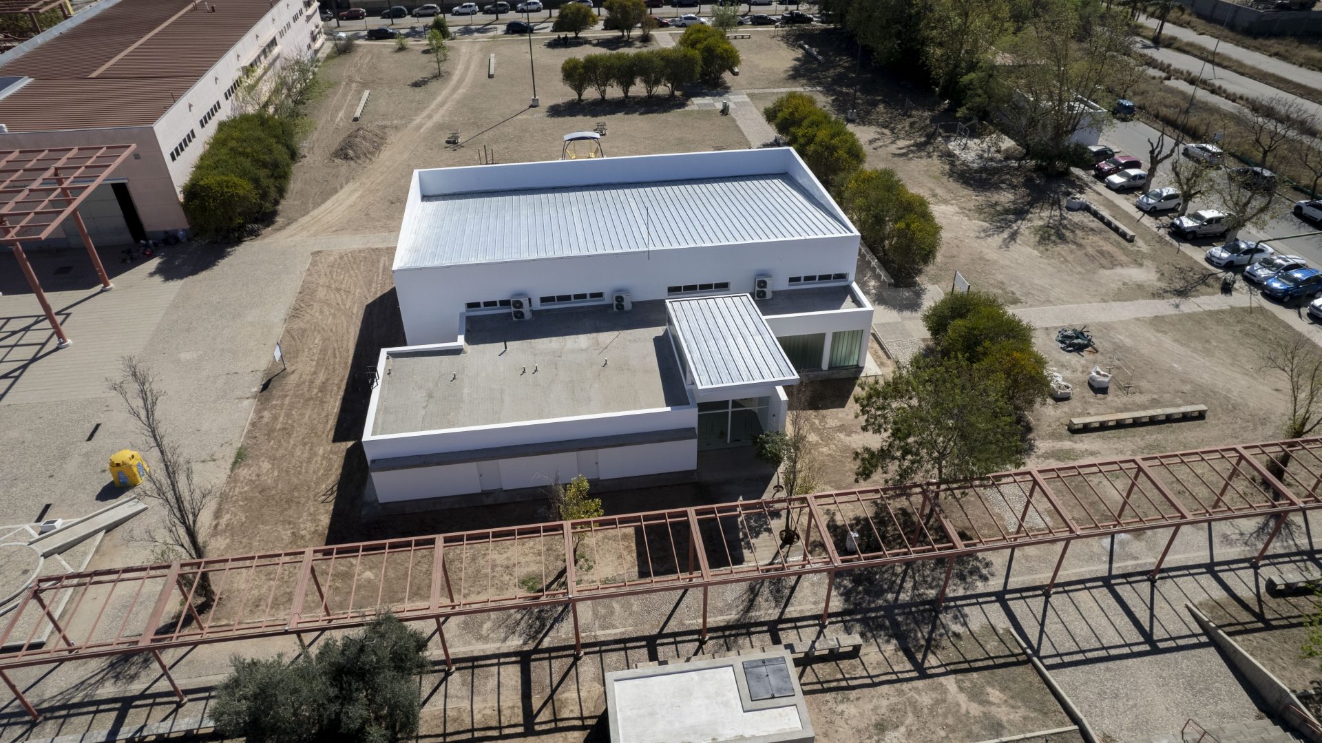 El edificio consta de 600 m2 cubiertos incluyendo aleros, de los cuales 360m2 corresponden a dos Salones para Danza; y el resto a Ingreso, circulaciones y módulos sanitarios con vestuarios.