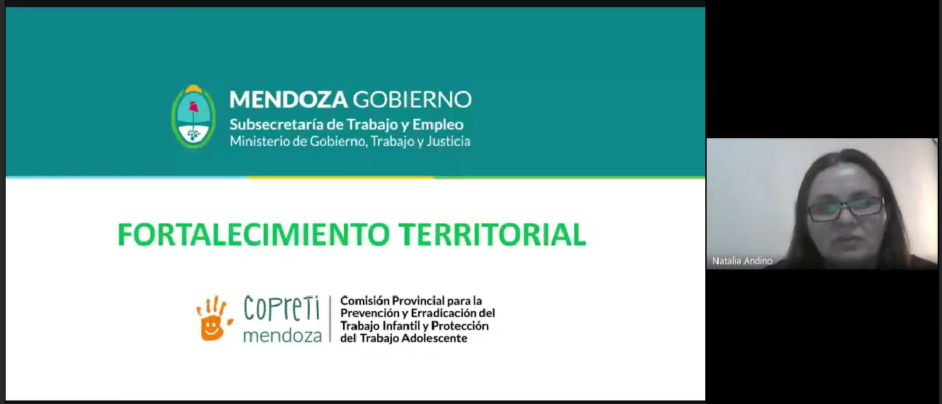 A lo largo del encuentro virtual se compartieron experiencias de tres provincias argentinas. El programa Jardines de Cosecha de la provincia de Salta, como ejemplo de una política sostenida en el tiempo y fruto de una gran articulación de actores público-privados fue expuesto por Pablo Lacroux de la Cámara Tabacalera de Salta.  Por su parte, la provincia de Mendoza estuvo representada por la integrante de COPRETI, Natalia Andino, quien compartió el proceso de Fortalecimiento de la articulación territorial de la Copreti Mendoza, desarrollo de gran riqueza en el diagnóstico regional-territorial de su provincia en alianza con efectores de salud, educación, la Universidad Nacional de Cuyo y la OIT. Finalmente, Edgardo Senen González de la provincia de La Pampa expuso la Experiencia territorial en Colonia Menonita planteando los desafíos por delante en materia de erradicación del trabajo infantil.