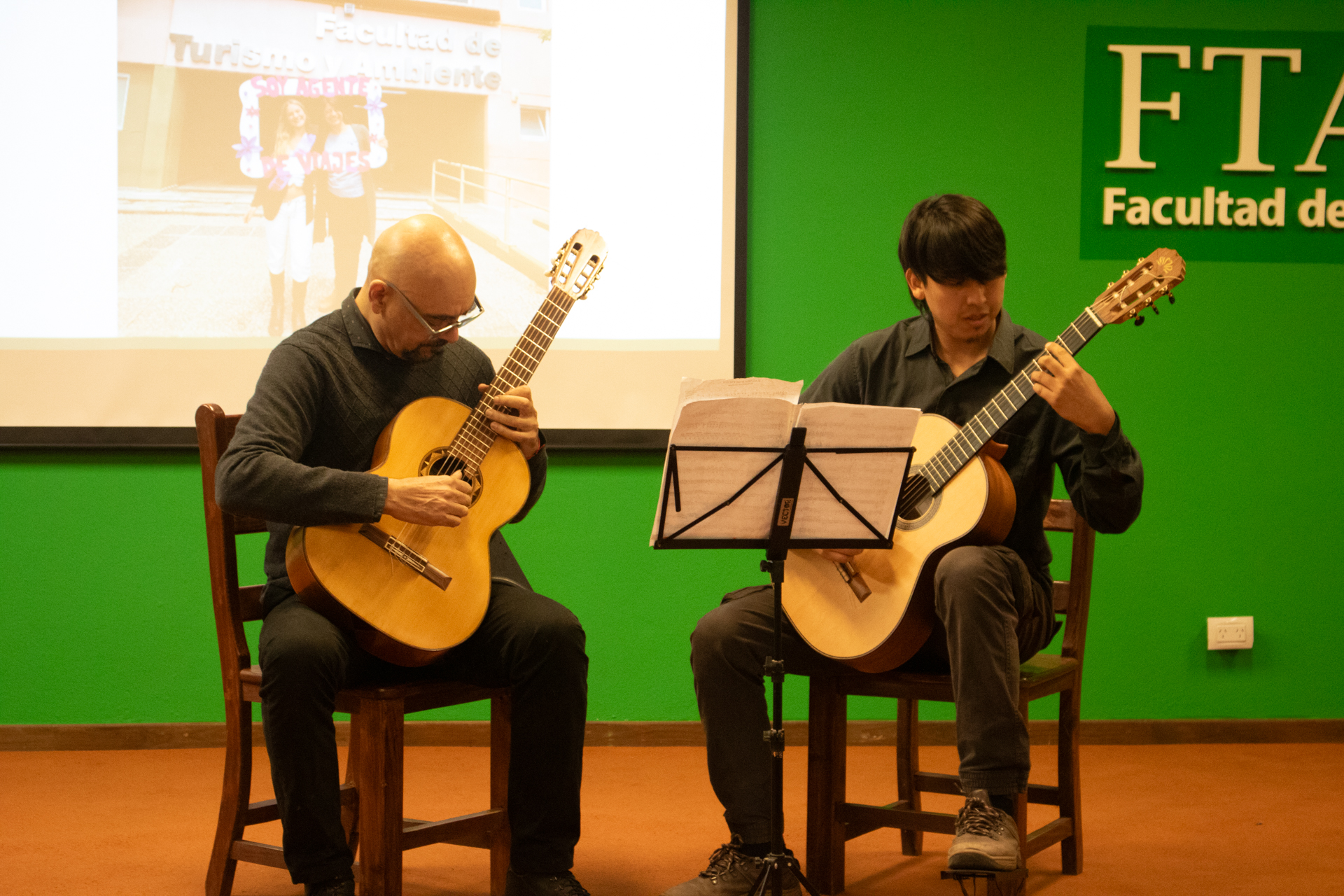 Posteriormente, el dúo de guitarristas Jorge Cordi y Franco Rivero, estudiantes del Conservatorio Superior de Música “Félix T. Garzón” de la Facultad de Arte y Diseño de la UPC, interpretaron “Dos valses poéticos” de Enrique Granados y “Serenata op.96” de Ferdinando Carulli.