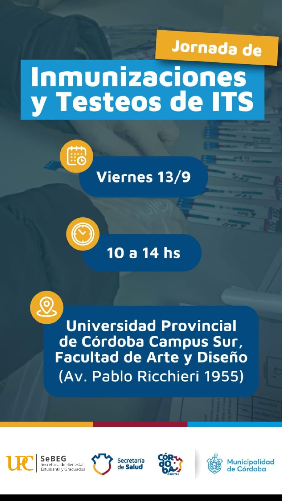 La Secretaría de Bienestar Estudiantil y Graduados de la Universidad Provincial de Córdoba, invita a sus estudiantes a formar parte de una jornada de inmunizaciones y testeos de ITS.