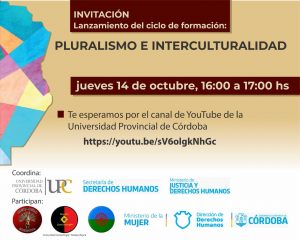 La Secretaría de Extensión y Relaciones Institucionales de UPC, junto a la Secretaría de Derechos Humanos del Ministerio de Justicia y Derechos Humanos de la Provincia, lanzan un ciclo de formación en pluralismo e interculturalidad, en conjunto con el Ministerio de la Mujer y la Dirección de Derechos Humanos de la Municipalidad de Córdoba. El encuentro será el jueves 14 de octubre, de 16:00 a 17:00 hs por el Canal de Youtube de la UPC.