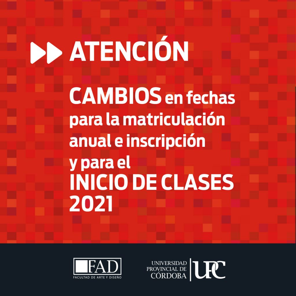 La Facultad de Arte y Diseño de la Universidad Provincial de Córdoba informa a la comunidad educativa y a los ingresantes al ciclo lectivo 2021 que por razones de fuerza mayor, -vinculadas a cuestiones tecnológicas-, ha tenido que definir una prórroga para algunas instancias de matriculación anual e inscripción a cursar, como así también la fecha de inicio de las clases en las carreras que a continuación se mencionan.
