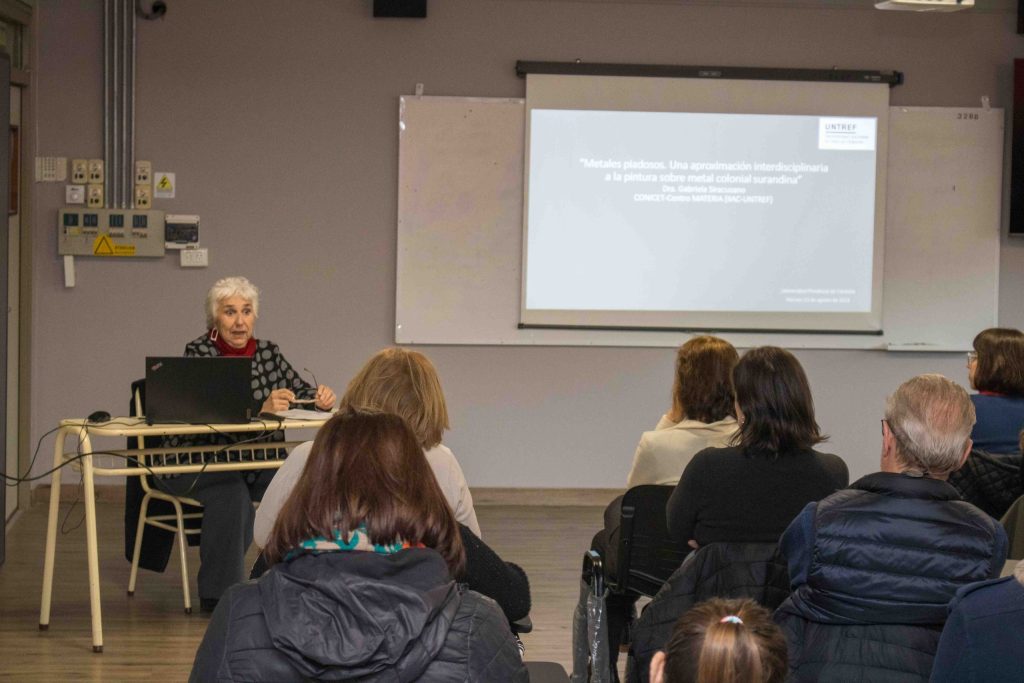 Gabriela Siracusano, directora del Centro Materia de la Universidad Nacional Tres de Febrero, brindó una conferencia magistral en la Universidad Provincial titulada «Metales piadosos. Una aproximación interdisciplinaria a la pintura sobre metal colonial surandina», en el marco de una actividad extensionista de la Facultad de Arte y Diseño (FAD).