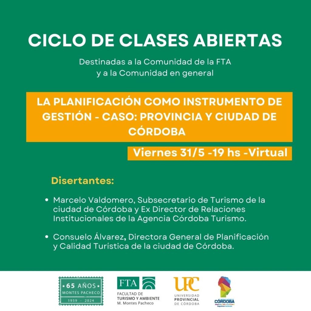 La Facultad de Turismo y Ambiente (FTA) de la Universidad Provincial de Córdoba invita al Ciclo de Clases Abiertas destinadas a la Comunidad de la FTA y a la Comunidad en general.
